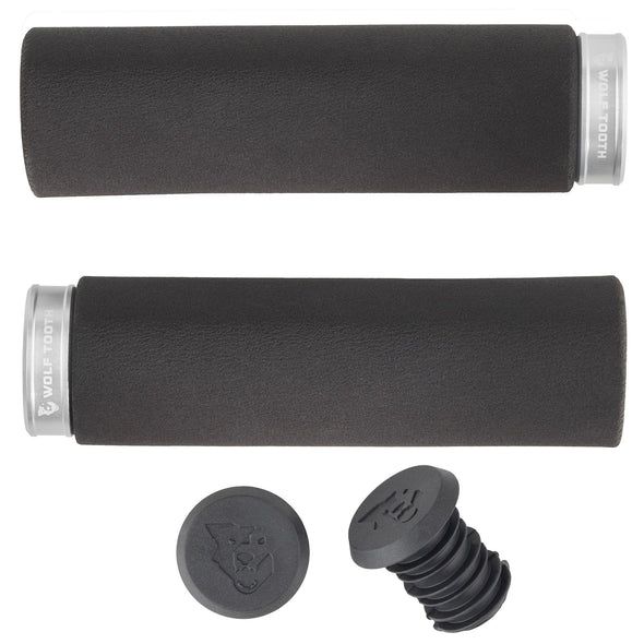 Grips are made with black silicone foam and come with anodized aluminum collars that match the eight primary colors of other Wolf Tooth anodized accent pieces. Includes Wolf Tooth rubber bar plugs. Upgrade to matching Alloy Bar plugs or store tools in your handlebars with the Wolf Tooth EnCase System.