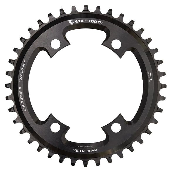 - Drop-Stop technology prevents dropped chains. On Wolf Tooth’s patented wide/narrow chainring, the wide side of the tooth has maximum contact on the drive side which spreads the load and improves chainring life. The narrow side allows clearance for mud and debris while reducing friction.
