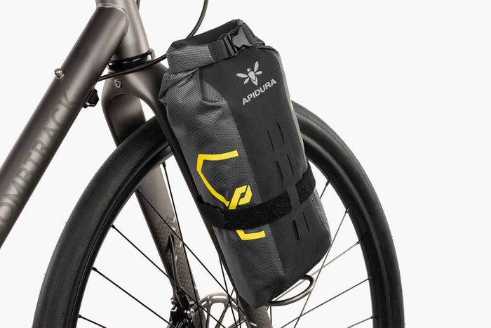 The attachment mechanism, unique to Apidura, ensures that the straps do not wrap around the fork itself. This makes removal and attachment far easier, and allows for access to contents without removal the fork bag. Multiple attachment loops and the ability to cut down straps ensures that the bag can be fitted to any fork cage.