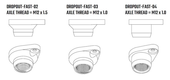 - DROPOUT-FAST-02, DROPOUT-FAST-03, and DROPOUT-FAST-04 are visually similar. Please verify shape and axle thread prior to purchase.