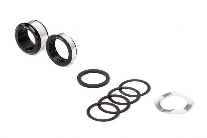Run M30 28/30mm spindle Praxis compatible cranks in a BSA threaded frame. Machined aluminum cups thread in to a standard threaded frame and feature ABEC-3 sealed bearings outboard of the BB shell. Fully serviceable.