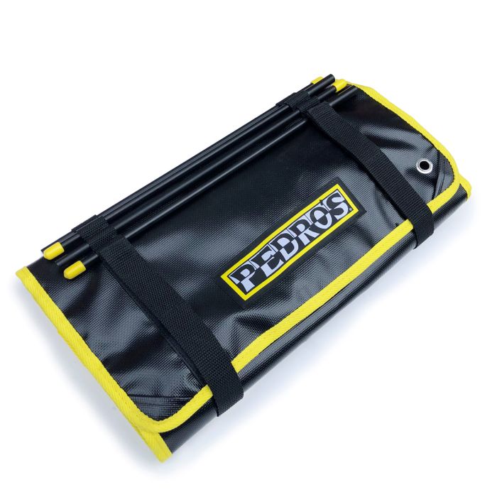 The Burrito Tool Kit offers 24 handpicked professional tools enclosed in a versatile waterproof tool roll. This ultra-portable tool kit leverages the versatility of Pedro’s hand tools to provide 31 functions covering an impressive range of adjustments, installations, and repairs making it perfect for the professional or enthusiast. The Burrito Tool Roll II features a large 23x16in (60x40cm) surface with numerous pockets in assorted sizes and types including a large mesh zipper pocket to securely hold small parts or personal items. The Burrito II also features a unique x-frame system that converts the flexible roll into a rigid tool pallet. Unroll, install the frame poles, hang off a repair stand or tool case, and get to work. Designed for easy transport and efficient storage, the Burrito Tool Kit is perfect for the car, taking to events, or a home shop setup.
