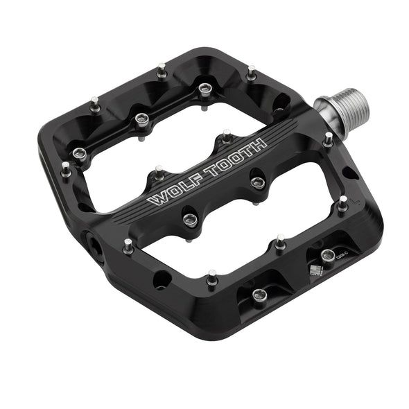 Wolf Tooth Waveform Aluminum Pedals are designed for all-mountain riding, from XC to downhill. The pedals come in two sizes, and are proportionally scaled to provide a supportive platform, shaped to match the footprint of your shoe. They have a slim, dual-concave profile that is 14mm thick at the perimeter and just 12.5mm thick in the center, cradling your foot for optimal pedal feel. Each side of the pedal has 11 stainless steel rear-loading pins for loads of traction. The design also features a large, tapered leading edge to deflect pedal strikes on rough terrain. A custom radial seal protects three fully sealed cartridge bearings for low-friction riding in all conditions.