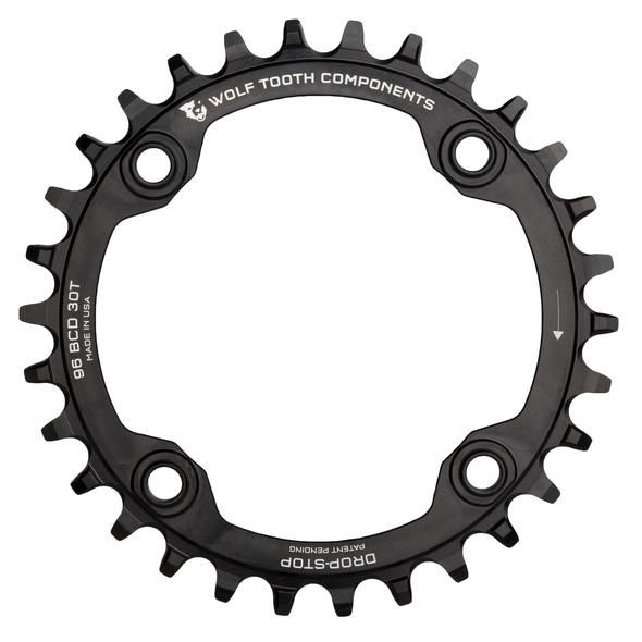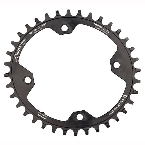 - Drop-Stop technology. On Wolf Tooth’s patented wide/narrow chainring, the wide side of the tooth has maximum contact on the drive side which spreads the load and improves chainring life. The narrow side allows clearance for mud and debris which reduces friction.