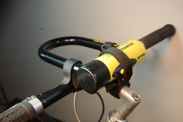 A new three-point handlebar mount for locks with large shackles. Works with Kryptonite’s New York Fahgettaboudit © U-lock, Abus’s Granit© U-lock series and OnGuard© Pit-bull series.