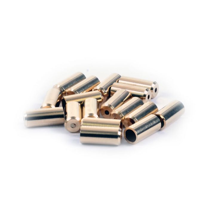 Precision-machined 4mm ID brass cable ferrules for improved shifting performance. A flat bottom on the inside prevents housing from pulling through ferrules. For use with most shifting cables.